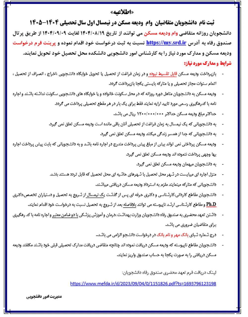 دانشجویان روزانه متقاضی وام ودیعه مسکن می توانند از تاریخ 1404/08/19 لغایت 1404/09/09 از طریق پرتال صندوق رفاه به آدرس https://my.srd.ir نسبت به ثبت درخواست خود اقدام نموده و پرینت فرم درخواست ودیعه مسکن و مدارک مورد نیاز را به کارشناس امور دانشجویی دانشکده محل تحصیل خود تحویل نمایند.