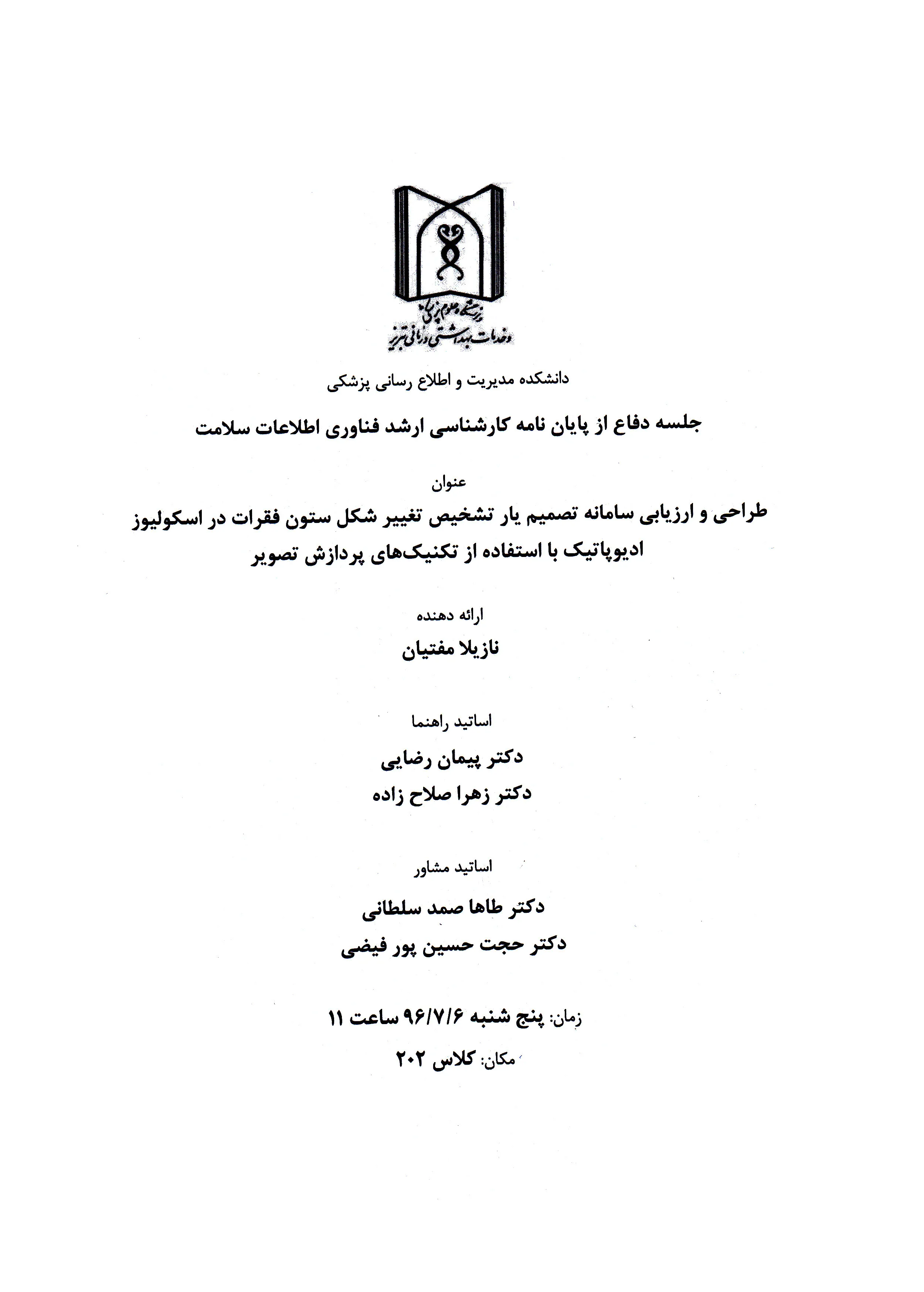 جلسه دفاع از پایان نامه کارشناسی ارشد فناوری اطلاعات سلامت (نازیلا مفتیان)