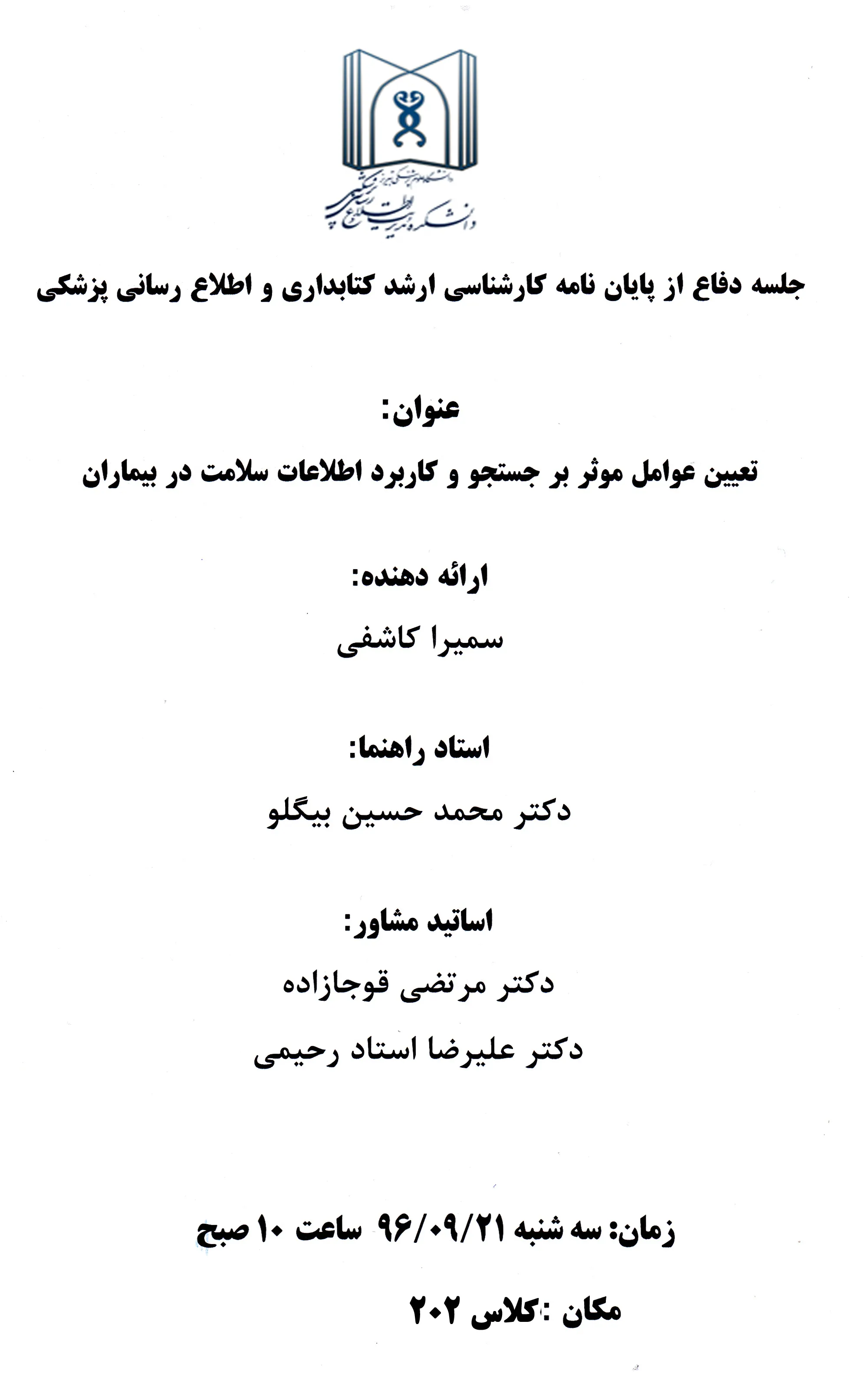 جلسه دفاع از پایاننامه کارشناسی ارشد کتابداری و اطلاع رسانی پزشکی (سمیرا کاشفی)