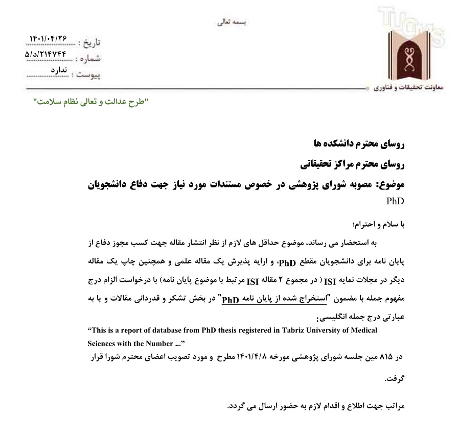 مصوبه شورای پژوهشی در خصوص مستندات مورد نیاز جهت دفاع دانشجویان PHD