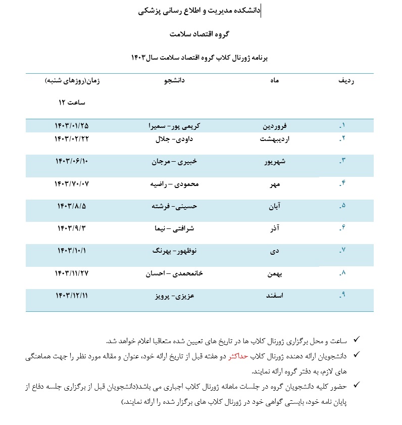 برنامه ژورنال کلاب گروه اقتصاد سلامت سال 1403